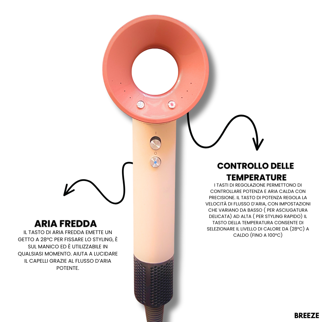 IL NOSTRO BREEZE PRO È IN GRADO DI EFFETTUARE UN'ASCIUGATURA COMPLETA E OTTIMALE IN SOLI 10/15 MINUTI, ADATTANDOSI AL VOLUME DEI VOSTRI CAPELLI. QUESTA PERFORMANCE È POSSIBILE GRAZIE AL POTENTE MOTORE DA 1600W E ALLA TECNOLOGIA AVANZATA IONICA, CHE AIUTA A RIDURRE L'EFFETTO CRESPO E A MANTENERE I CAPELLI LUCIDI E SALUTARI. INOLTRE, IL CONTROLLO DELLA TEMPERATURA GARANTISCE UN'ASCIUGATURA GENTILE E PROTETTIVA, SENZA SOGGETTARE I CAPELLI A ELEVATE TEMPERATURE CHE POTREBBERO DANNEGGIARLI